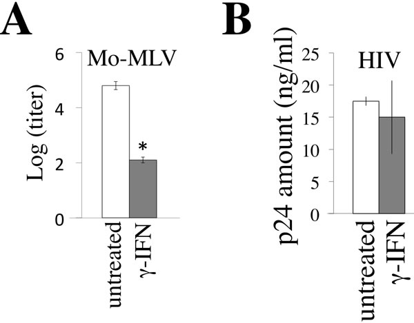 Figure 1: γ-IFN restricts MLV replication but not HIV-1 replication. A. TE671/mCAT1 cells were treated with γ-IFN (0.2 µg/ml) for 1 day, and then inoculated with the Moloney MLV. The MLV titers were measured 3 days after the inoculation. B. TE671/CD4 cells were treated with γ-IFN (0.2 g/ml) for 1 day, and then inoculated with the HIV-1 LAI strain. The p24 amounts in culture supernatants were measured 3 days after the inoculation. These experiments were repeated three times. Means are indicated. Error bars show standard deviations. Asterisks indicate statistically significant differences.