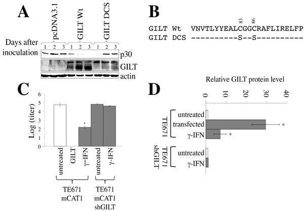 Figure 2: GILT inhibits MLV replication. A. TE671/mCAT1 cells were transfected with pcDNA3.1, wild type GILT, or the DCS mutant, and inoculated with Mo-MLV. Lysates of the inoculated cells were analyzed by western blotting, using the indicated antibodies. B. Amino acid sequences near the thiolreductase active site are indicated. The GILT DCS mutant contains the substitutions of two cysteine residues to serine. C. TE671/mCAT1 cells stably transduced by the empty or shGILT-expressing lentivirus vector were treated with γ-IFN (0.2 µg/ml), and inoculated with Mo-MLV. Three days after the inoculation, Mo-MLV titers were measured by XC plaque assay (n = 3). Error bars show standard deviations. Asterisks indicate statistically significant differences. D. TE671 cells were transfected by pcDNA3.1 or GILT. TE671 cells transduced by the empty or shGILT-expressing vector were treated with γ-IFN (0.2 µg/ml). GILT and actin proteins were detected by western immunoblotting, and the intensities of the proteins were measured by a densitometer. The amounts of GILT were normalized by the actin levels. The amounts of GILT in pcDNA3.1-transfected cells are always set to 1, and relative values are indicated (n = 3).