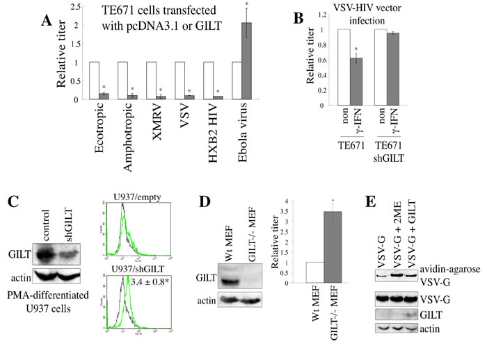 Figure 4: GILT inhibits viral entry by digesting S-S bonds of viral Env protein. A. TE671 cells transfected with pcDNA3.1 (open bars) or GILT (closed bars) were inoculated with HIV-1 vector pseudotyped with indicated viral Env proteins. Relative values to titers in the pcDNA3.1-transfected cells are indicated (n = 3). Asterisks indicate statistically significant differences. B. Control and shGILT-expressing TE671 cells were treated with γ-IFN (0.2 µg/ml), and were inoculated with the VSV-pseudotyped vector. Relative values to titers in the untreated cells are indicated (n = 3). Asterisks indicate statistically significant differences. C. Control and shGILT-expressing U937 cells were treated with PMA. Lysates from the differentiated cells were analyzed by western blotting (left panel). The PMA-differentiated cells were inoculated with the VSV-pseudotyped HIV-1 vector encoding GFP, and the inoculated cells were analyzed by flow cytometry. Relative values to numbers of GFP-positive cells in control U937 macrophages are indicated (n = 3) (right panel). D. Cell lysates prepared from MEFs of GILT-knockout and wild type mice were subjected to western immunoblotting (left panel). The MEF2 were inoculated with the amphotropic MLV vector. Relative values to transduction titers in the wild type MEFs are indicated (n = 3). E. COS7 cells were transfected by VSV-G, together with pcDNA3.1 or GILT. COS7 cells transfected by VSV-G and pcDNA3.1 were treated with 2-mercaptoethanol (2ME) as a positive control. Proteins with free cysteine residues were isolated, and analyzed by western blotting (see Materials and Methods) (upper panel). Cell lysates from the transfected cells were analyzed by western blotting (three lower panels). Representative results are indicated.