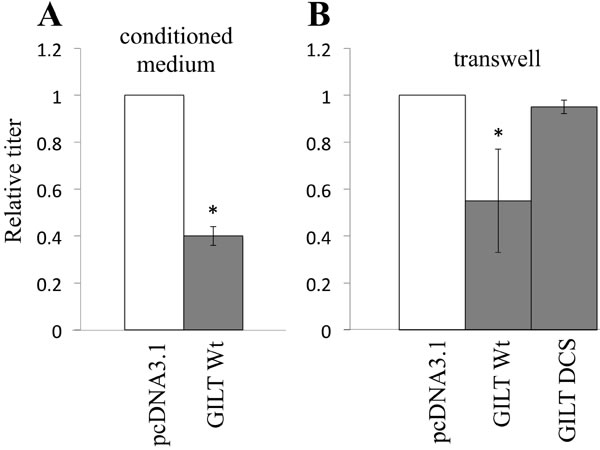 Figure 5: Secreted GILT inhibits viral infection. A. VSV-pseudotyped HIV-1 vector was diluted with culture supernatant from the pcDNA3.1- or GILT-transfected COS7 cells, and inoculated to HeLa cells. B. Target HeLa cells were cultured with the pcDNA3.1- or GILT-transfected COS7 cells in transwells. The HeLa cells were inoculated with amphotropic MLV-pseudotyped HIV-1 vector. Relative values to titers in the pcDNA3.1-transfected cells are indicated (n = 3). Asterisks indicate statistically significant differences.