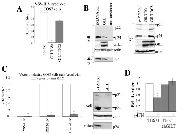 Figure 6: GILT inhibits HIV-1 virion production. A. COS7 cells were transfected with the VSV-pseudotyped HIV-1 vector construction plasmids, together with pcDNA3.1, wild type GILT, or the DCS mutant. Culture supernatants from the transfected cells were used to inoculate HeLa cells, and titers were measured. Relative values to titers in the pcDNA3.1-transfected cells are indicated (n = 3). Asterisks indicate statistically significant differences. B. Cell lysates and virion pellets from the transfected cells were analyzed by western blotting. C. COS7 cells were transfected with the VSV-, HXB2-, or Ebola virus-pseudotyped HIV-1 vector construction plasmids together with pcDNA3.1 or wild type GILT, and transduction titers of culture supernatant from the transfected cells were measured. Relative values to titers in pcDNA3.1-transfected cells are indicated (n = 3). Cell lysates and virion pellets from the Ebola virus-pseudotyped HIV-1-producing cells were analyzed by western blotting. D. Control and shGILT-expressing TE671 cells were transfected with the VSV-pseudotyped HIV-1 vector construction plasmids, and were cultured with or without γ-IFN (0.2 µg/ml). Culture supernatants from the cells were used to inoculate HeLa cells, and the titers were measured (n = 3).