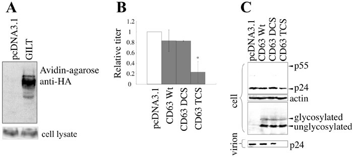 Figure 7: GILT inhibits HIV-1 virion production by digesting S-S bonds in CD63. A. COS7 cells stably expressing CD63-HA were transfected with pcDNA3.1 or GILT. Proteins with free cysteine residues were isolated, and analyzed by western blotting (upper panel). CD63 protein levels in cell lysates were also analyzed by western blotting (lower panel) B. COS7 cells were transfected with VSV-pseudotyped HIV-1 vector construction plasmids, together with pcDNA3.1, HA-tagged wild type CD63, or the DCS or TCS mutant, and culture supernatants from the transfected cells were used to inoculate HeLa cells. Relative values to titers in the pcDNA3.1-transfected cells are indicated (n = 3). Asterisks indicate statistically significant differences. C. Cell lysates and virion pellets from the transfected cells were analyzed by western blotting.