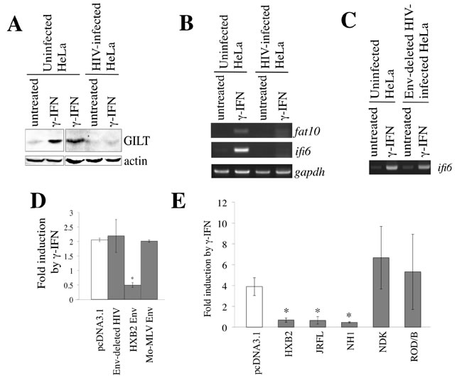 Figure 10: HIV-1 Env inhibits γ-IFN signaling. A. HeLa cells were inoculated with VSV-pseudotyped replication-competent HIV-1 LAI, and then treated with γ-IFN (0.2 µg/ml). Cell lysates from the infected and uninfected HeLa cells were analyzed by western blotting. B. HeLa cells were inoculated with the VSV-pseudotyped HIV-1 LAI strain, and then treated with γ-IFN (0.2 µg/ml). Total RNA samples were prepared from the treated cells, and fat10, ifi6, and gapdh mRNA levels were measured by RT-PCR. C. HeLa cells were inoculated with the VSV-pseudotyped wild type or env-deleted HIV-1. The ifi6 and gapdh mRNAs were measured by RT-PCR. D. and E. HeLa cells were transfected with CMV-R-Luc and GAS-F-Luc, together with indicated plasmids. The transfected cells were treated with γ-IFN (0.2 µg/ml), and Renilla and firefly luciferase activities were measured. The fold induction of firefly luciferase per Renilla luciferase by γ-IFN is indicated (n = 3). Asterisks indicate statistically significant differences.
