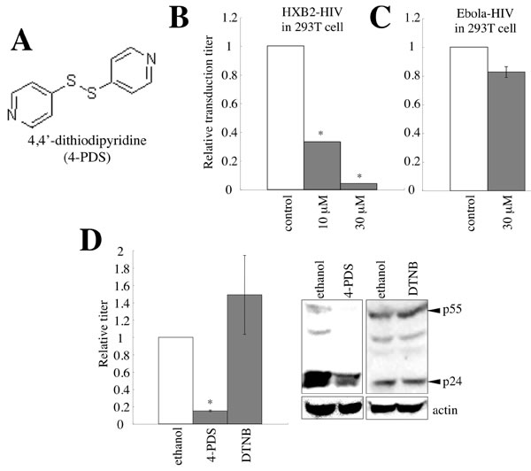 Figure 11: 4,4’-dithiodipyridine (4-PDS) restricts the entry and virion production of HIV-1 vector. A. Chemical structure of 4-PDS is indicated. B. 293T/CD4 target cells were pre-treated with 4-PDS, and inoculated with the HXB2 Env-containing HIV-1 vector. Relative values to transduction titers in solvent (ethanol)-treated cells are indicated (n = 3). Error bars show standard deviations. Asterisks indicate statistically significant differences. C. 293T cells pretreated with 4-PDS were inoculated with the Ebola virus-pseudotyped HIV-1 vector. D. 293T cells were transfected with the VSV-pseudotyped HIV-1 vector construction plasmids. The transfected cells were treated with 4-PDS or DTNB (30 µM) for 1 day, 24 hr after the transfection. The cells were washed with medium to remove the chemicals, and cultured for 5 hr. Transduction titers of the culture supernatants were measured. Relative values to titers in equal volume of ethanol-treated cells are indicated (n = 3). Cell lysates from the treated cells were analyzed by western blotting.