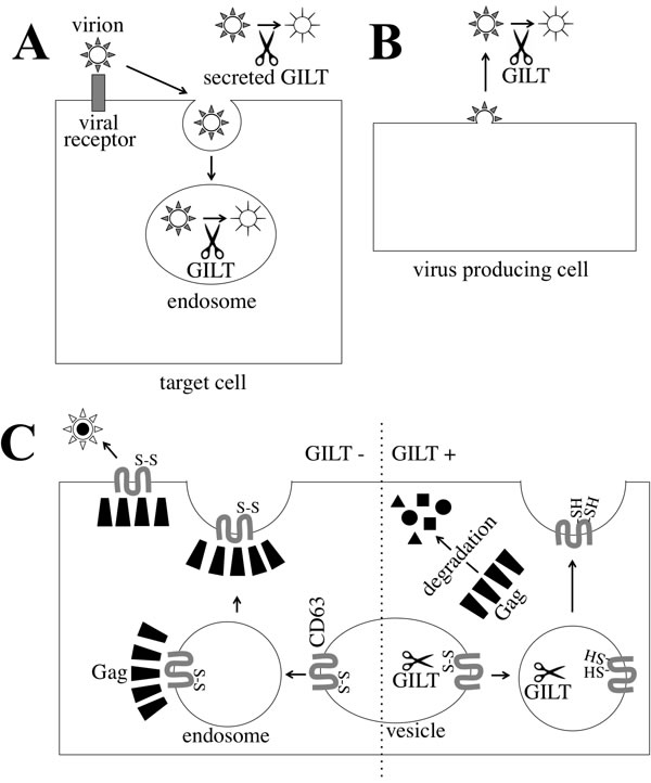 Figure 12: Mechanism by which GILT inhibits retrovirus replication. A. A viral particle is internalized to an endosome of a host cell. In the endosome, GILT digests S-S bonds of the viral Env proteins, and attenuates the infection. Secreted GILT also digests S-S bonds of the viral Env proteins. B. GILT does not inhibit MLV virion formation, but decreases infectivity of released MLV particles. GILT digests S-S bonds of viral Env protein in the released viral particle. C. In GILT-negative cells, HIV-1 Gag protein forms a complex with CD63, and is transported to cell surface. Finally, virions are formed and released. In GILT-expressing cells, CD63 S-S bonds are digested, and HIV-1 Gag protein cannot form a complex with disulfide bond-deficient CD63. The free HIV-1 Gag protein is degraded by an unknown mechanism.