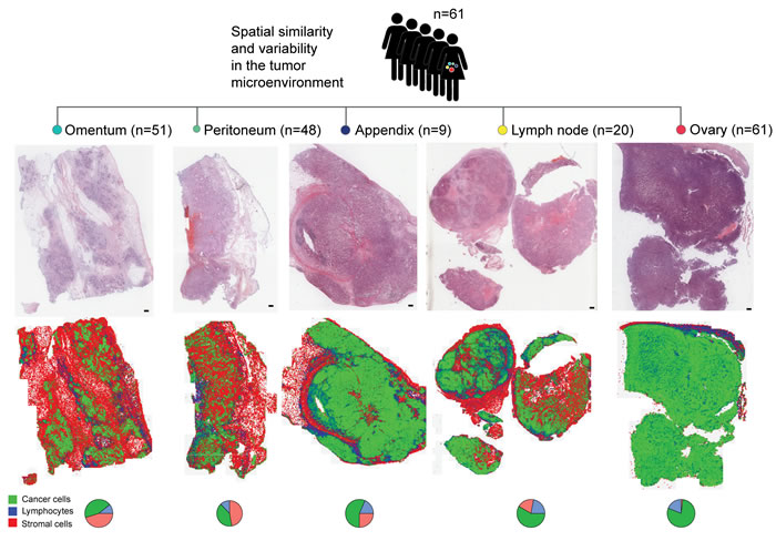 Figure 1: Study design depicting automated analysis of tumor microenvironments in multiple metastases of 61 patients with locally advanced HGSOC. H&E images are depicted next to spatial maps of cancer cell (green), lymphocyte (blue) and stromal cell (red) distributions. Pie charts depict the quantitative cell composition in respective sections. Scale bar represents 2 mm.