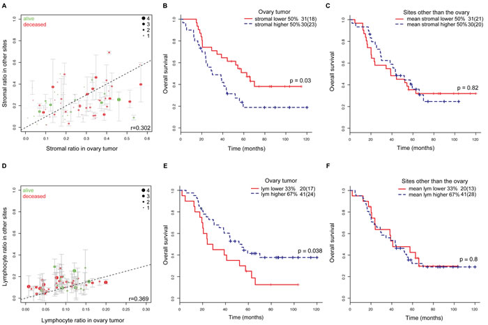 Specifically, HGSOC patients with diverse microenvironment or high MetDiv score in their local metastases have a staggering 5-year overall survival of 9%, compared with 42% for patients with low MetDiv scores. Although there was a moderate degree of similarity in the amount of stromal cells between ovary tumors and other sites (Pearson correlation r = 0.302), only stromal cell abundance measured in ovary tumors but not in other sites was associated with poor overall survival in these locally advanced diseases (p = 0.03, HR = 1.99, CI = 1.07-3.72). Similar conclusions were drawn in our analysis comparing lymphocyte abundance in ovary and other sites. These results underscore the clinical significance of stromal and lymphocyte abundance in ovary tumors but not in other tumor sites.