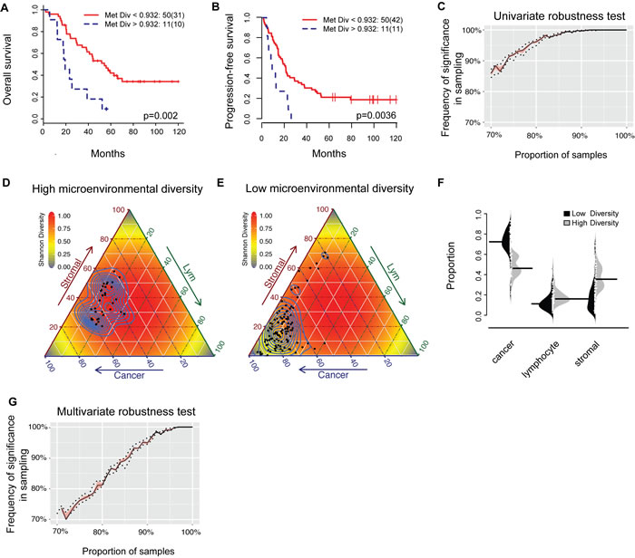 A factor that could influence the reliability of MetDiv score is the amount of tissue used for our analysis. To test this, we simulated the scenario that only half of a tumor was available and computed the MetDiv score based on the new data (Methods). We found that the difference between the original and the new Shannon diversity score was very small (standard deviation = 0.0016-0.0006; Supplementary Figure 5a). The prognostic value of MetDiv for OS and PFS based on the new scores remained significant (p < 0.005). We further evaluated the robustness of the MetDiv score by randomly sampling 100% / 75% / 50% of cells from the whole-section images (Supplementary Figure 5b), revealing an even smaller standard deviation of the diversity score (0.0003), thereby supporting the stability of the MetDiv score against variable amount of tissue used for analysis.