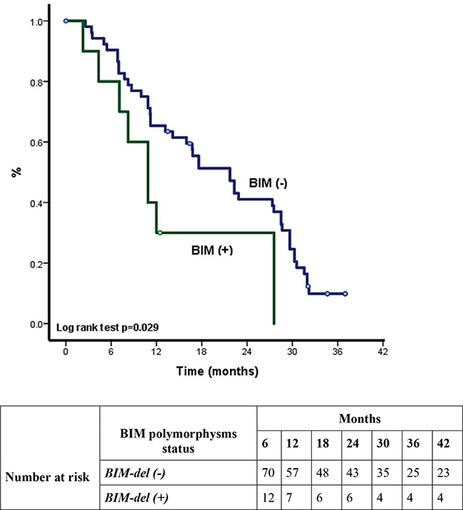 BIM is a member of the B-cell CLL/Lymphoma 2 (Bcl-2) family of proteins and has been related with apoptosis modulation triggered by EGFR-TKIs [21–23]. BIM deletion polymorphisms (BIM-del) consist of intronic deletion polymorphisms in the gene. These polymorphisms switched BIM splicing from exon 4 to exon 3, which resulted in expression of BIM isoforms lacking the proapoptotic Bcl-2-homology domain 3 (BH3) [20]. These germline alterations could have a crucial role in determining how a tumor responds to EGFR-TKIs; however, few studies (none from Latin America) have examined the clinical usefulness of detecting BIM deletion polymorphisms and its relation with clinical characteristics in EGFR positive NSCLC. To determine the usefulness of detecting BIM-del in patients with EGFR mutation-positive NSCLC, we examined the outcomes of Hispanic patients with and without BIM alterations.