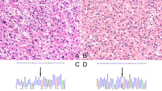 Figure 1: Examples of discordance in TERT mutation status between primary and corresponding recurrent HCC. A. Histology of primary HCC with ES grade 3 and B. electropherogram of TERT C228T mutation C. Histology of recurrent HCC with ES grade 2 and D. electropherogram of TERT C228T mutation