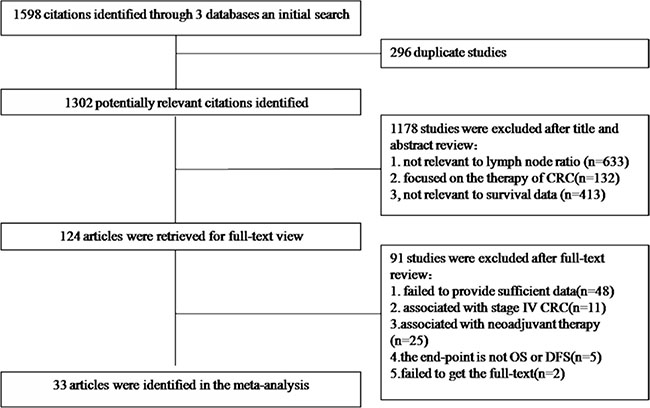 We identified 1598 potentially relevant articles from our search of the published literature. After removing duplications, scanning titles and abstracts and reading the full-text, 33 records [5, 7–38] encompassing a total of 81,331 (75,838 node positive) CRC patients were eligible for the present study based on our inclusion and exclusion criteria (Figure 1).