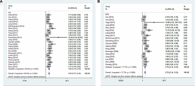 Funnel plots and Egger’s test were conducted to evaluate the publication bias of included studies. No obvious visual asymmetry was observed in funnel plots (Figure 4) for OS, and the P values of the Egger’s test were 0.800. However, statistically significant publication bias was found in the studies of DFS (Egger’s test P value = 0.000). The funnel plot for the studies of DFS showed an asymmetrical distribution of the studies (Figure 4). Therefore we used the trim-and-fill method (Figure 5). As a consequence, there were 6 potential missing studies, and after these 6 potentially unpublished studies were filled, the recalculated pooled HR was 2.24 (95% CI: 1.75–2.88, p < 0.00001) in the random effects model. That indicated a positive outcome even though publication bias still exists.