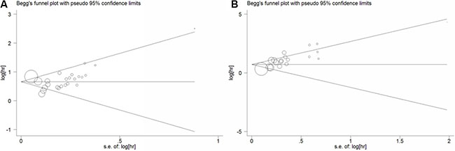 Figure 4: Funnel plot of the association between LNR and overall survival (A), disease free survival (B).