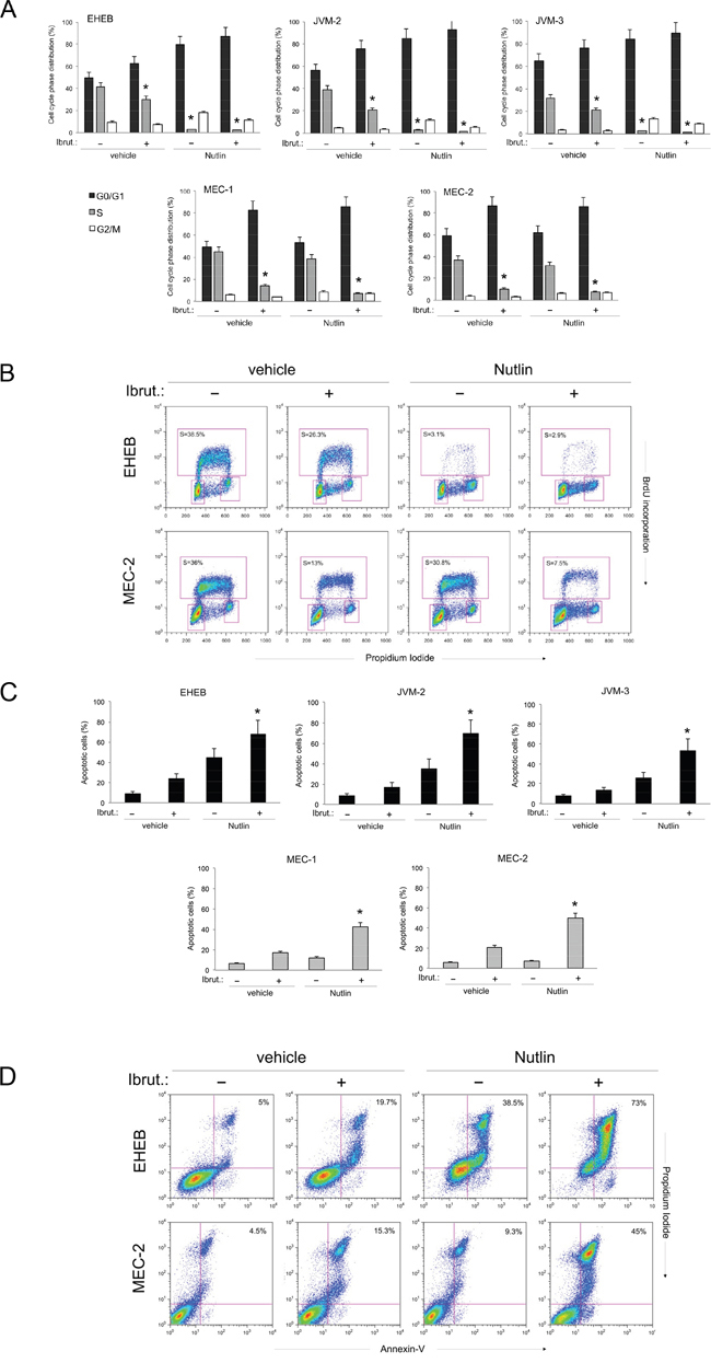For in vitro treatments with Ibrutinib (PCI-32765) (Selleckchem, Houston, TX), used either alone or in combination with Nutlin-3 (Cayman Chemicals, Ann Arbor, MI), cells were seeded at a density of 1x106 cells/mL. In selected experiments, Ibrutinib was assessed also in combination with the RG7112 MDM2 inhibitor (Selleckchem). At different time points after treatment, cell viability was examined by Trypan blue dye exclusion and MTT (3-(4, 5-dimethilthiazol-2yl)-2, 5-diphenyl tetrazolium bromide) colorimetric assay (Roche Diagnostics Corporation, Indianapolis, IN) for data confirmation, as previously described [41, 42]. In order to investigate the concentration required to induce death in 50% of cells respect to control, IC50 values were calculated from dose-response curves constructed by plotting cell survival (%) versus drug concentration. The cell cycle profile was analyzed by 5-bromodeoxyuridine (BrdU) incorporation assessed by flow cytometry, as previously described [43]. Levels of apoptosis were quantified by Annexin V-FITC/propidium iodide (PI) staining (Immunotech). To avoid non-specific fluorescence from dead cells, live cells were gated tightly using forward and side scatter, as described [44].