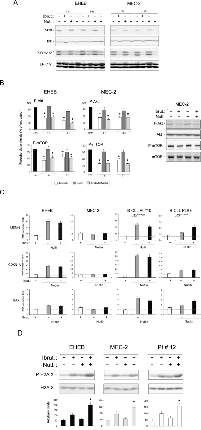 Figure 4: Intracellular pathway mediating the anti-leukemic activity of Ibrutinib/Nutlin-3 combination. EHEB (p53wild-type) and MEC-2 (p53mutated) leukemic cell lines, as well as representative B-CLL patient (Pt.) samples, were exposed to Ibrutinib (10 μM) and Nutlin-3 (10 μM) used either alone or in combination and were evaluated at different time points, as indicated. In A. western blotting analysis of activated (phosphorylated) and total Btk and ERK1/2 protein levels are shown. In B. phosphoprotein expression levels for Akt and m-TOR were measured by fluo-immunobeads assays. Analyses of phosphoprotein levels were performed by Luminex system and results are indicated as folds of induction with respect to the control untreated cultures set at 100. The asterisk indicates p<0.05 respect to the untreated. Validation by western blotting analysis is shown. In C. levels of CDKN1A, MDM2 and BAX were analyzed after 24 hours of treatment by quantitative RT-PCR. mRNA levels are expressed as fold of modulation with respect to the control untreated cultures set at 1. Results are reported as means±SD of at least three independent experiments, performed in duplicate. The asterisk indicates p<0.05 respect to control vehicle. In D. western blotting analysis of activated and total H2A.X protein levels performed on B-leukemic cell lines and primary B-CLL samples. The asterisk indicates p<0.05 respect to single treatments. In A, B and D, blots representative of at least three independent experiments yielding equivalent results are shown.