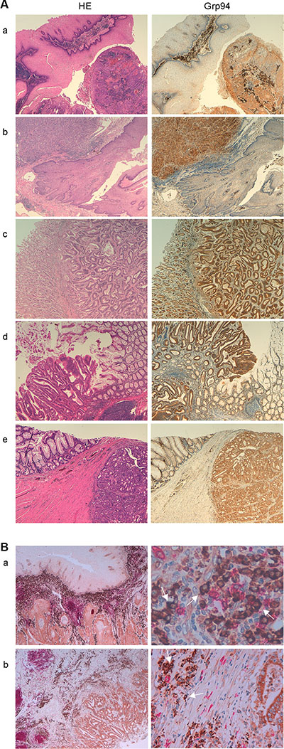 Figure 1: Grp94 marks cancer cells of any tumor of the GI tract and cells of tumor infiltrates. (A) Specimens of different tumors (a, oesophageal squamous cell carcinoma; b, adeno-carcinoma of the gastro-enteric junction; c, tubular-type adeno-carcinoma of the stomach; d and e, large bowel adeno-carcinomas) were stained with H&E and incubated with rat monoclonal anti-Grp94 Abs for specific immunostaining, as specified in Methods. Magnifications are 10× (a–d) and 20× (e). (B) Double immunostaining for both CD20+ cells (anti-human CD20cy Abs) and Grp94 of specimens of: a, oesophageal squamous cell carcinoma (20×, left) showing diffuse infiltration of B cells into the tumor stroma with the enlargement (63×, right) showing that the Grp94-positive cells are mostly plasma cells (arrows); b, large bowel carcinoma (10×, left) with enlargement (40×, right) revealing the same features as in a.