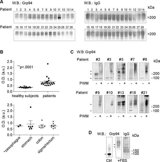 Figure 2: Grp94 in complexes with IgG is the form in which the tumor antigen Grp94 circulates in plasma and is presented by plasma cells. (A) WB for Grp94 and IgG in plasma of all patients. Patients are numbered following the order by which they were analyzed. Ten μg of proteins of each plasma sample was loaded on to 4–20% polyacrylamide gel in denaturing conditions of PAGE, without boiling and reducing treatment of samples. WB was performed as specified in Methods, probing the membrane with primary anti-Grp94 monoclonal Abs (clone 9G10, Santa Cruz Biotech., Santa Cruz, CA, USA) followed by anti-rat HRP-conjugated secondary Abs, and with primary anti-human IgG polyclonal Abs followed by anti-sheep HRP-conjugated secondary Abs. Cropped WB of samples 1–14 and samples 15–28 originate from two distinct membranes. Patient #16 was then excluded from the following analyses for having a tumor that secondarily involved the large bowel. Only the Grp94-positive bands in the membranes are shown since no other band was visualized. Grp94 at masses higher than 200 kDa indicates the formation of complexes with IgG, as proved by the intense co-positivity for human IgG of the Grp94-positve bands (see WB on right). Specificity of the immune reaction was also evaluated by probing the membranes with only secondary Abs. (B) In the upper panel, scatter plots are shown of ELISA determinations of Grp94-IgG complexes in plasma of 15 healthy subjects and 22 cancer patients (13 males, 9 females). Measurements were made by testing each plasma sample in duplicate at the dilution of 1:128, and absorbance was measured at 450 nm (OD, optical density). Horizontal lines indicate the mean value with SE. Minimum and maximum OD values were, respectively, 0.27 and 0.458 in healthy subjects, and 0.506 and 2.31 in patients. The mean ± SE of OD values in healthy subjects was 0.346 ± 0.013, and in patients 0.796 ± 0.0817. Lower and upper 95% CI of the mean was 0.318 and 0.375 in healthy subjects, 0.627 and 0.966 in patients. The difference between the two groups was statistically significant (Mann-Whitney test, two-tailed). The lower panel shows the ELISA measurements in the same patients grouped by type of tumor. The mean ± SE OD values did not differ significantly among groups. The patient with the highest value of OD (2.31) died after two months from the admission. (C) Cropped WB for Grp94 on lysates of PBMCs of a representative number of patients (eight with large bowel adenocarcinomas and two with gastric carcinomas). Patients #3, #7, #9, #10 and #13 had tumors at stage III/IV. PBMCs were incubated in absence (control) and presence of the B cell stimulatory agent Pokeweed mitogen (PWM) at 20 μg/ml (final concentration), and after 10 days of incubation cells were lysed and treated as specified in Methods. The protein concentration was previously determined by means of calibration SDS-PAGE (10% polyacrylamide gel) and the same protein quantity (without boiling and reducing treatments) was loaded for each sample on to a 4–20% polyacrylamide gel and then probed with anti-Grp94 rat monoclonal Abs. Specificity of the reaction was assessed by probing the membrane with secondary Abs only. Stimulation by PWM leads to the increased expression of Grp94 at molecular masses much higher than the expected mass of the protein, consistent with the association of Grp94 in big complexes with IgG (WB for human IgG in Supplementary Figure S2B). Arrows mark the bands positive for Grp94 that in control PBMCs focus at molecular masses of both the monomer (100 kDa) and dimer (200 kDa), whereas in PWM-treated cells mostly appear at masses consistent with the formation of big complexes. Adjustments of the contrast and brightness were applied to each WB image. (D) Cropped WB for Grp94 and IgG on Grp94 in culture medium of PBMCs in absence (control, without incubation) and presence of 10% FBS (after incubation). Fifty μg of Grp94, in absence of reducing treatment, were loaded in each lane of a 4–20% polyacrylamide gel and probed with anti-Grp94 rat monoclonal Abs and anti-IgG sheep polyclonal Abs. Arrows mark the band of Grp94 that in absence of FBS appears in its free form, prevalently as monomer (100 kDa), whereas in the presence of FBS Grp94 focuses exclusively at high molecular masses in association with IgG. Blots for incubated Grp94 derive from a single membrane. No adjustments were made for the blots of Grp94, whereas slight adjustments for contrast and brightness were applied to the blot of IgG.