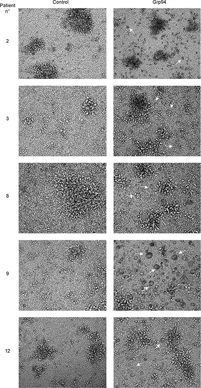 Figure 3: PBMCs of cancer patients challenged with Grp94 in complex with IgG are stimulated to differentiate into macrophages. Microscopic evaluation of PBMCs of representative cancer patients (#2, #8 and #12, males; #3 and #9, females), with large bowel adenocarcinomas (patients #2, #3, #9 and #12) and gastric carcinoma (patient #8) cultured for ten days in both absence (control) and presence of 100 ng/ml of Grp94. Images are shown (20×) representative of several others taken at the optical microscope (Phase Contrast Leyca DMI 4000B, equipped with DFC camera 480). Arrows indicate the cells that mostly populate PBMC cultures after treatment with Grp94, identified as macrophages of various sizes.