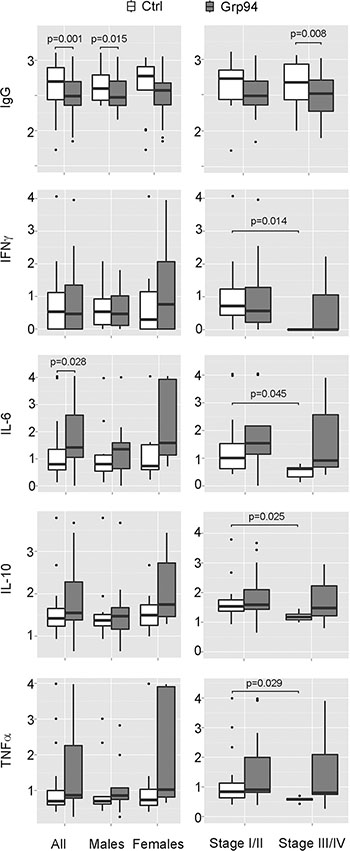 It has been reported that a significant infiltration of B lymphocyte-derived Ig commonly occurs in pre-malignant and malignant stroma of several solid human cancers [35] and that cancer, but not normal cells express high levels of IgG that promote the proliferation and the diffusion of the tumor [36]. Both tumor and circulating complexes of Ig are associated with an increased tumor burden and poor prognosis [37], a reason for which targeting B cells for reducing the aberrant Ig production has been proposed as a useful therapeutic approach in different human tumors [35–37]. In the light of these observations and of the significant infiltration of B cells and Grp94-positive plasma cells found in tumor stroma of our patients, we wanted to explore the effect of Grp94 on IgG production by PBMCs. A concentration-dependent, statistically significant reduction of the IgG concentration in cell media was observed with Grp94 in all patients and also in males and females considered separately (Figure 4, panels on left and Supplementary Table S1). In particular, in male patients, Grp94 caused similar median reductions of 26% and 25% at 10 and 100 ng/ml, respectively, whereas in females a clearer concentration-dependent effect of Grp94 was apparent, with median reductions of 27% and 38% at 10 and 100 ng/ml of Grp94, respectively (Supplementary Table S1). Similar, concentration-dependent and significant reductions in IgG were observed with Grp94 when data were analyzed in patients grouped for stage of the tumor (Figure 4, panels on right and Supplementary Table S2).