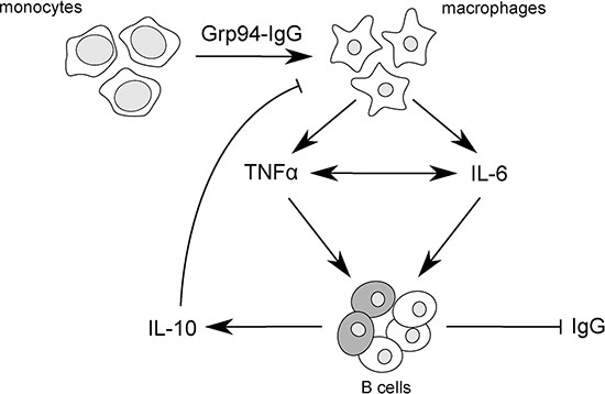Figure 5: Scheme of proposed mechanism by which Grp94-IgG complexes might promote inflammatory responses in PBMCs of cancer patients. Grp94-IgG complexes in cell culture medium of PBMCs drive the transformation of monocytes to macrophages that are induced to secrete both TNFα and IL-6. TNFα and IL-6 positively influence each other’s secretion [50], potentiating the overall inflammatory effect. TNFα in turn acts as effective inhibitor of Ig production by B cells [54], in this way favoring the reactive production of IL-10 from a subset of regulatory B cells [55] (shadowed cells in the figure). IL-10 negatively regulates the macrophage production of both TNFα and IL-6, thus counteracting the immune response. In this view, the predicted mechanism of the antigen-driven inflammatory response coupled with the inhibition of IgG secretion would be mostly mediated by TNFα.
