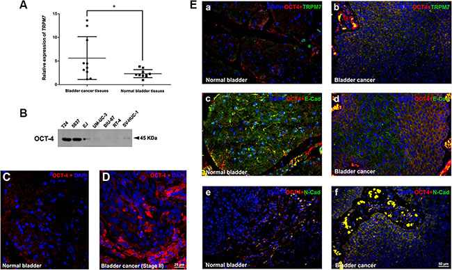 Figure 2: TRPM7 is upregulated in the BCa tissues and correlated with EMT markers. (A) qRT-PCR analysis of relative gene expression of TRPM7 in total RNA isolated from ten BCa tissues at stage II, comparing with ten normal bladder tissues. Significance of TRPM7 expression difference was analyzed using T-test. *p < 0.05. (B) Western blot analysis of OCT-4 protein abundance in the human BCa cell lines (T24, 5637, EJ, UM-UC-3, BIU-87, RT-4) and immortalized normal uroepithelial cell line (SV-HUC-1), cell types and protein masses were indicated. (C–D) Representative immunofluorescence staining of OCT-4 (red) in the BCa tissue (D) comparing with the normal bladder tissue (C). Nuclears were stained by DAPI (blue). The images were photographed by fluorescence microscopy. The scale bar for C and D is 25 μm. (E) Representative double immunofluorescence staining of TRPM7, E-cadherin and N-cadherin (green) in the BCa tissues (b, d, f) comparing with normal bladder tissues (a, c, e). OCT-4 (red) was used as a marker of BCa cells, suggesting upregulation of TRPM7 and N-cadherin in the OCT-4 positive BCa cells (b and f), whereas a downregulation of E-cadherin (d). Nuclears were stained by DAPI (blue). The scale bar for E (a-f) is 50 μm.