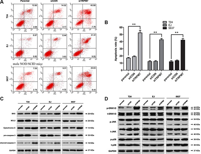 Figure 6: TRPM7 deficiency induced BCa cell apoptosis via ERK1/2 pathway. (A) Representative flow cytometry analysis of apoptosis stained with Annexin V and PI in parental, siCON- and siTRPM7-transfected BCa cells. (B) Statistical analysis of apoptotic rate (%) in the three BCa cell lines after the siRNA treatment. Cell types and treatment of siRNA were indicated. The values shown were mean ± SD of triplicate measurements and repeated three times with similar results. Statistical significance was calculated using ANOVA. **p <0.01. (C) Western blot analysis for proteins involvement in mitochondrial dependent apoptotic pathway, such as BAX, BCL2, Cytochrome C and related proteins pro-caspase 3 and cleaved-caspase 3. (D) Proteins in the MAPK family were affected indicated by Western blot analysis. Phosphorylated and total ERK1/2, JNK and p38 at protein level was analyzed, suggesting a dominated activation of ERK1/2 in the MAPK family by the siTRPM7. GAPDH abundance was used as a control. Cell types, treatment of siRNA and protein masses were indicated.
