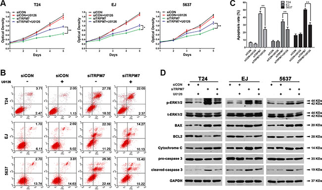 Figure 7: Recovering siTRPM7-induced BCa cell apoptosis by U0126 to deactivate ERK1/2. (A) T24, EJ, 5637 cells were pre-treated by U0126 at 10 mM for 2 h and treated by siTRPM7 for 48 h, comparing with siCON and parental cells. Proliferation of the BCa cells were analyzed by CCK-8 assay. Cell types and treatment of siRNA were indicated. *p < 0.05, **p < 0.01. (B) Apoptotic cells staining with Annexin V and PI were revealed by flow cytometry analysis and the apoptotic rates were statistically analyzed (C). Values of statistical data shown were mean ± SD of triplicate measurements and repeated three times with similar results. Statistical significance was calculated using ANOVA. *p < 0.05, **p < 0.01. (D) Western blot analysis for phosphorylated and total ERK1/2 as well as mitochondrial dependent apoptotic pathway proteins (BAX, BCL2, Cytochrome C, pro-caspase 3 and cleaved-caspase 3). GAPDH abundance was used as a control. Cell types, treatment of siRNA and protein masses were indicated.