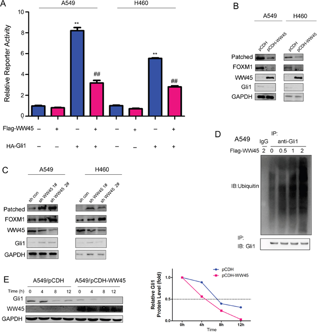 Figure 2: WW45 inhibited the activation of Hedgehog signaling. A. Luciferase reporter assay demonstrated that WW45 impaired the activation of Hedgehog/Gli1 signaling. B. Over-expression of WW45 down-regulated the expression of Hedgehog/Gli1 target genes, such as Patched and FOXM1 in A549 and H460 cells. C. Knocking down the expression of WW45 up-regulated the expression of Hedgehog/Gli1 target genes, such as Patched and FOXM1 in A549 and H460 cells. **: P<0.01. D. WW45 promoted the ubiquitination of Gli1 in a dose-dependent manner. The WW45 expression plasmid (Flag-WW45) was transfected into A549 cells. 48 hours later, cells were treated with MG132. 8 hours later, cells were lysed and the immunoprecipitation was performed using anti-Gli1 antibody. The ubiquitination was examined using the anti-ubiquitin antibody. E. The half-life of WW45 was shortened upon the over-expression of WW45. A549 cells were treated with CHX (1μg/ml) and harvested at different time point, and the expression of Gli1 was examined.