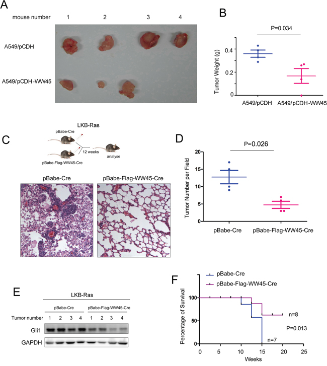 Next, we over-expressed WW45 in A549 cells and investigated whether WW45 impaired the tumorigenecity of lung cancer cells in vivo using the nude mice. The results came out that over-expression of WW45 inhibited the tumorigenesis of A549 in the nude mice (Figure 4A–4B). Moreover, to further investigate whether WW45 suppressed the progression of lung cancer, we used a well-characterized NSCLC mouse model initiated by Kras G12D and LKB1 loss (LKB-Ras in short). LKB-Ras mice were treated with retro-virus expressing Cre and WW45 (Flag-WW45), and analyzed 12 weeks after virus infection. Up-regulation of WW45 reduced the tumor number significantly compared with the control group (Figure 4C–4D). In addition, the expression of Gli1 in the tumors over-expressing WW45 was down-regulated (Figure 4E). Moreover, over-expression of WW45 prolonged the survival of LKB-Ras mice (Figure 4F). Taken together, over-expression of WW45 inhibited the initiation and progression of lung cancer.