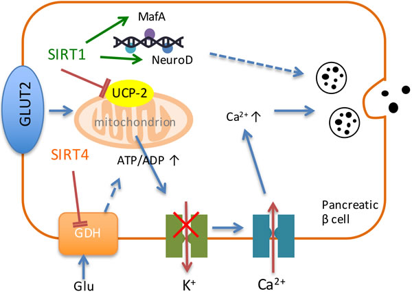 25. Grimm AA, Plueger MM and Bernal E. Increased dosage of mammalian Sir2 in pancreatic beta cells enhances glucose-stimulated insulin secretion in mice. Cell Metabolism. 2005; 2:105-117.
