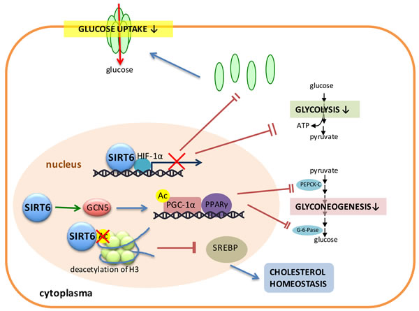 In addition, SIRT6 can down-regulate glycolysis by inhibiting the expression of several key glycolytic genes [94]. Furthermore, SIRT6 appears as a co-repressor of the transcription factors such as HIF-1α, which is a critical regulator of nutrient stress responses (Figure 3). SIRT6 deficient cells exhibit increased HIF-1α activity and increased glucose uptake with up-regulation of glycolysis and diminished mitochondrial respiration [93]. SIRT6 also plays a direct role in controlling glyconeogenesis. For example, SIRT6 interacts with and enhances the activity of General Control Non-repressed Protein 5 (GCN5), which, in turn, catalyzes the acetylation of PGC-1α and the consequent activation of PPARγ to down-regulate the expression of glyconeogenesis-related enzymes such as PEPCK-C and G6P, and subsequently inhibits the process of gluconeogenesis to represse hepatic glucose production (Figure 3) [18].