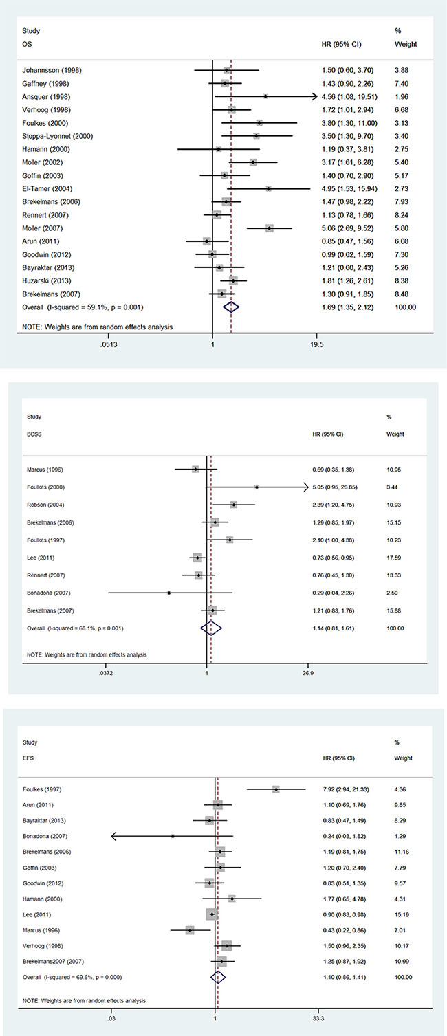 Figure 2: Forest plot showing the association between BRCA1 mutation and survival. (A) Forest plot showing the association between BRCA1 and OS. (B) Forest plot showing the association between BRCA1 and BCSS. (C). Forest plot showing the association between BRCA1 and EFS.