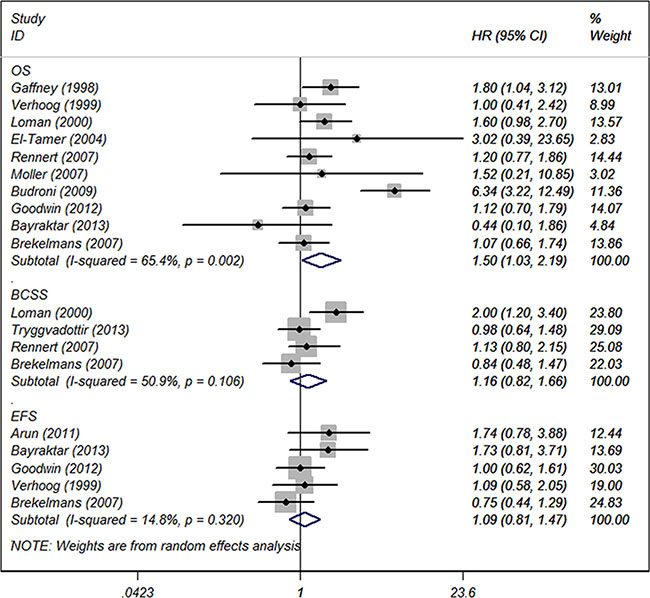 The data extraction was conducted by two authors independently and cross checked to make sure for accuracy. Any uncertainty about the extracted data was deliberated and resolved by agreement between the authors. OS was used as the primary outcome measure which was defined as the time from initial breast cancer diagnosis to death due to any causes. Breast cancer-specific survival (BCSS) and event-free survival (EFS) were set as the secondary outcome measures. Breast cancer-specific survival (BCSS) was defined as the time from initial breast cancer diagnosis to death due to breast cancer. Both distant disease-free survival (DFS) and recurrence-free survival (RFS) were defined as the interval between surgical resection of the primary breast cancer and the first recurrence of the tumor. Freedom from distant metastasis (FFDM) was defined from the date of initial breast cancer diagnosis until the date of first distant metastasis. EFS was defined as the time from initial breast cancer diagnosis until the date of last follow-up evaluation, development of metachronous contralateral breast cancer, relapse of cancer, or distant metastasis, whichever occurred first. DFS, RFS and FFDM were analyzed together as EFS.