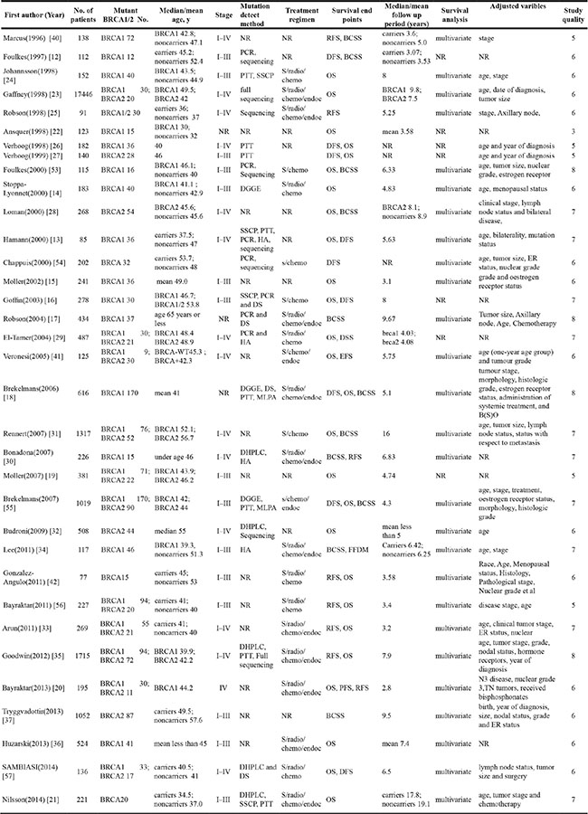 Abbreviations: PTT = protein truncation test; SSCP = single-strandson-formationalsolymorphism; DGGE = denatured gradient gel electrophoresis; HA = heteroduplex analysis; DHPLC=denaturing high performance liguld chromatography; DS = direct sequencing; MLPA = multiples ligation-dependent probe amplification; S = surgery; radio = radiotherapy; chemo = chemotherapy; endo = endocrinotherapy; OS = overall survival; BCSS= cancer-specific survival; EFS = event-free survival; FFDM= Freedom from distant metastasis ; RFS = recurrence-free survival; DFS = disease-free survival;