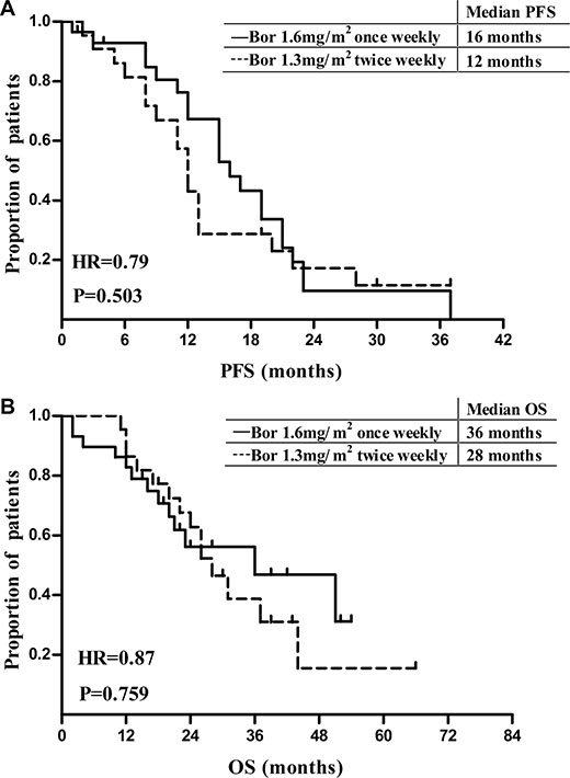 In current study, the modified bortezomib-based (1.6 mg/m2, intravenously on day 1, 8, regimens were not inferior to conventional ones (1.3 mg/m2, intravenously on day 1, 4, 8, 11) in terms of responses, survival benefit and AEs incidence.
