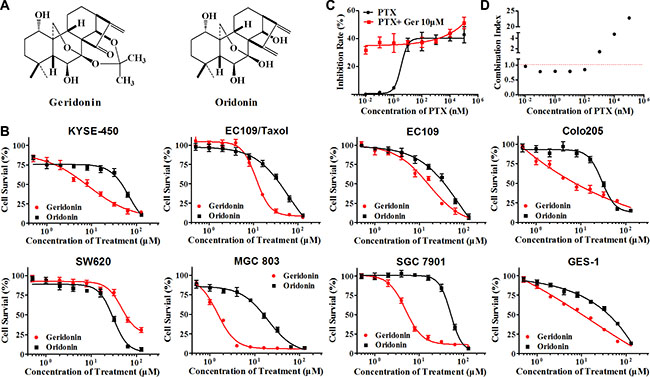 Figure 1: Geridonin (Ger) and paclitaxel (PTX) act synergistically to inhibit the proliferation of MGC 803 cells. (A) Chemical structure of geridonin and oridonin. (B) Inhibitory effect of geridonin and oridonin treatment for 72 h. (C) Treatment with paclitaxel or paclitaxel in combination with 10 μM geridonin for 24 h inhibits the proliferation of MGC 803 cells. (D) CIs of paclitaxel and geridonin. MGC 803 cells were treated with geridonin, oridonin, paclitaxel, or geridonin plus paclitaxel for 24 h. Cell viability was assessed using MTT assays. The CIs were calculated using CompuSyn. Data are presented as the mean ± SD of triplicate tests.