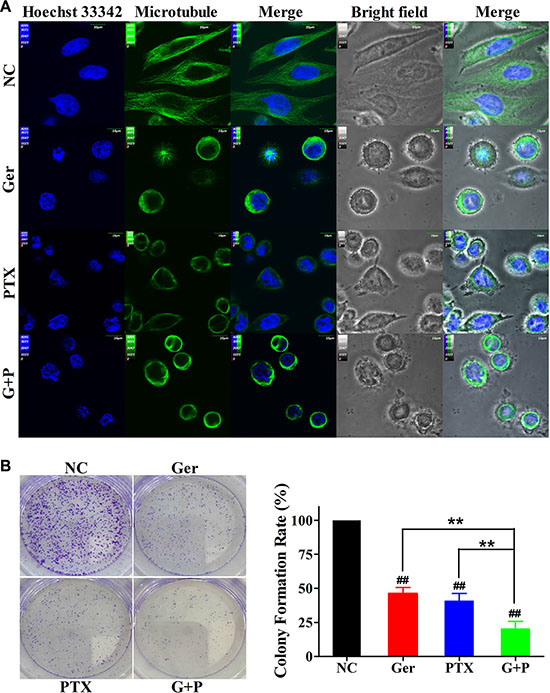 Figure 2: Geridonin enhances the inhibitory effects of paclitaxel on MGC 803 cells. (A) Treatment of MGC 803 cells with geridonin (10 μM) and paclitaxel (15 nM) for 24 h perturbs microtubule organization. The α-tubulin staining is shown in green and the nuclei are stained with Hoechst 33342 (blue). Scale bar is 10 μm. (B) Treatment of MGC 803 cells with geridonin (10 μM) and paclitaxel (15 nM) for 12 h decreases colony formation. #P < 0.05 versus the negative control; ##P < 0.01 versus the negative control; *P < 0.05; **P < 0.01.
