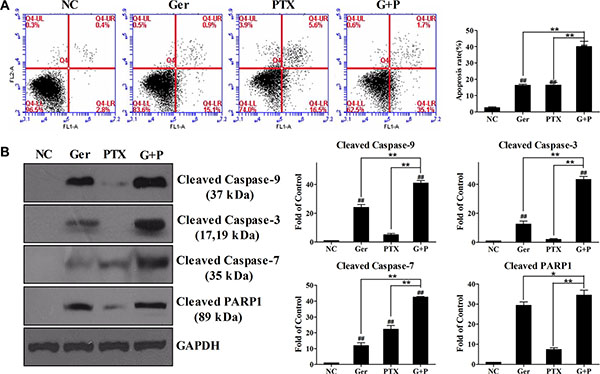 Figure 3: Geridonin enhances paclitaxel-induced apoptosis in MGC 803 cells. (A) Apoptosis induced by treatment of MGC 803 cells with geridonin (10 μM), paclitaxel (15 nM), or geridonin plus paclitaxel for 24 h. (B) Activation of the caspase cascade after treatment of MGC 803 cells with geridonin (10 μM), paclitaxel (15 nM), or geridonin plus paclitaxel for 24 h. Data are presented as the mean ± SD of three independent experiments. #P < 0.05 versus the negative control; ##P < 0.01 versus the negative control; *P < 0.05; **P < 0.01.