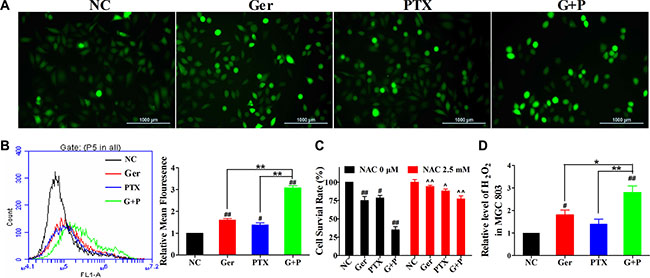 Figure 5: Geridonin and paclitaxel act synergistically to increase ROS levels in MGC 803 cells. (A) ROS detection following treatment with geridonin (10 μM), paclitaxel (15 nM), or geridonin plus paclitaxel for 12 h. Scale bar is 1000 μm. (B) Quantitative analysis of intracellular ROS levels by flow cytometry. (C) Analysis of cell survival after treatment of MGC 803 treated with geridonin (10 μM), paclitaxel (15 nM), or geridonin plus paclitaxel in the presence or absence of NAC. Data are presented as the mean ± SD of three independent experiments. #P < 0.05 versus the negative control; ##P < 0.01 versus the negative control; *P < 0.05; **P < 0.01; ^P < 0.05 versus the group that received the same treatment without NAC; ^^P < 0.01 versus the group that received the same treatment without NAC. (D) Levels of H2O2 in MGC 803 cells after treatment.
