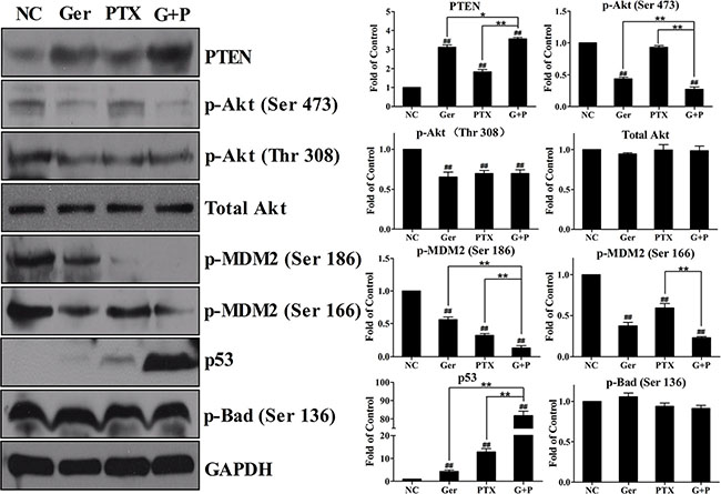 Figure 6: Geridonin and paclitaxel act synergistically to inhibit the PI3K/Akt pathway in vitro through regulation of PTEN expression. Western blot analysis after treatment of MGC 803 cells with geridonin (10 μM), paclitaxel (15 nM), or geridonin plus paclitaxel for 24 h. GAPDH was used as a loading control. #P < 0.05 versus the negative control; ##P < 0.01 versus the negative control; *P < 0.05; **P < 0.01.