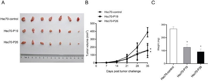 Figure 5: Effects of treatment with Hsc70-peptide fusion protein in transplantable lung tumor model of mouse. A. Photograph showed tumor formation in BALB/c SCID mice injected with Hsc70-P19, Hsc70-P26, and Hsc70-control. B. Hsc70-P19 and Hsc70-P26 treatment elicited a significant delay in tumor growth, compared with Hsc70-control treatment. C. Tumor weight was significantly inhibited in mice with Hsc70-P19 and Hsc70-P26 treatment, compared with Hsc70-control treatment. Data are shown as the mean (±SDs). Statistically significant differences are indicated. *, P < 0.05.