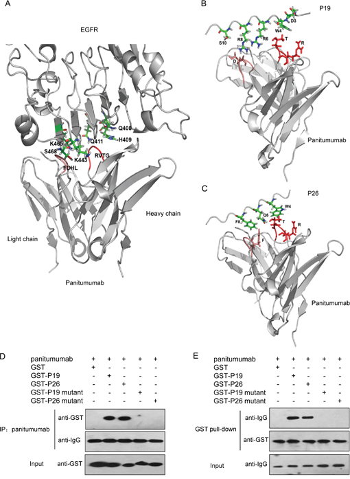 Figure 6: Three-dimensional models of the EGFR-panitumumab and mimotope-panitumumab complex and determination of functional amino acides in peptides. A. A side view of the interaction of EGFR domain III with panitumumab Fab. The backbone of EGFR and panitumumab Fab are shown in gray. CDR3 of VH and VL contributing to the crucial interaction with EGFR are shown in red and light red, respectively. Amino acids from EGFR that are directly involved in binding to panitumumab Fab are displayed. B. Detailed view of the P19-panitumumab interface. C. Detailed view of the P26-panitumumab complex. The backbone of panitumumab Fab is shown in gray. Amino acids in CDR3 of VH and VL which contributed to the interaction with P19 and P26 are shown in red and light red, respectively. Amino acids of P19 or P26 involved in the interaction with panitumumab Fab are shown. D. co-IP to evaluate panitumumab interaction with GST-P19 mutant and GST-P26 mutant. E. GST pull-down assay to determine the binding of GST-P19 mutant and GST-P26 mutant to panitumumab. Purified GST fusion proteins were coincubated with panitumumab. The complexes were precipitated as described, followed by western blot with antibodies against GST and human IgG, respectively.