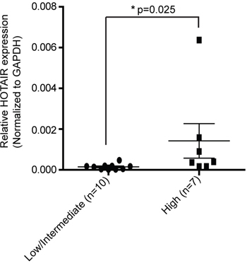 Figure 1: HOTAIR expression is higher in high-risk GISTs than in low/intermediate-risk GISTs. The expression level of HOTAIR was determined by qRT-PCR in 17 surgically resected tissues using the 2-ΔΔct method. Data shown represent the mean ± SEM. The asterisk denotes a statistically significant difference between high-risk and low/intermediate-risk GISTs (*P ≤ 0.05).