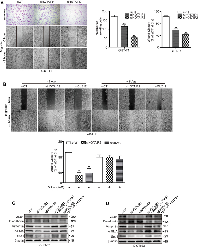 Figure 4: siHOTAIRs suppress cell invasiveness and migration capacity. A. Matrigel-transwell invasion (upper row) and wound healing assays (second and third rows) were performed using GIST-T1 cells transfected with siHOTAIRs, and were observed after 48 hours. The bar graph indicates the number of invading cells and percentage of wound closures. B. 5-Azacytidine was treated after transfection with siCT, siHOTAIR or siSUZ12. C and D. GIST cells transfected with siCT, siHOTAIRs, or siHOTAIR+pcDNA-HOTAIR were analyzed for EMT markers via Western blot. Figures are representative of three independent experiments. Data are expressed as mean ± SEM (n=3). The asterisk denotes a statistically significant difference compared to scrambled controls (*P ≤ 0.05, **P ≤ 0.01).