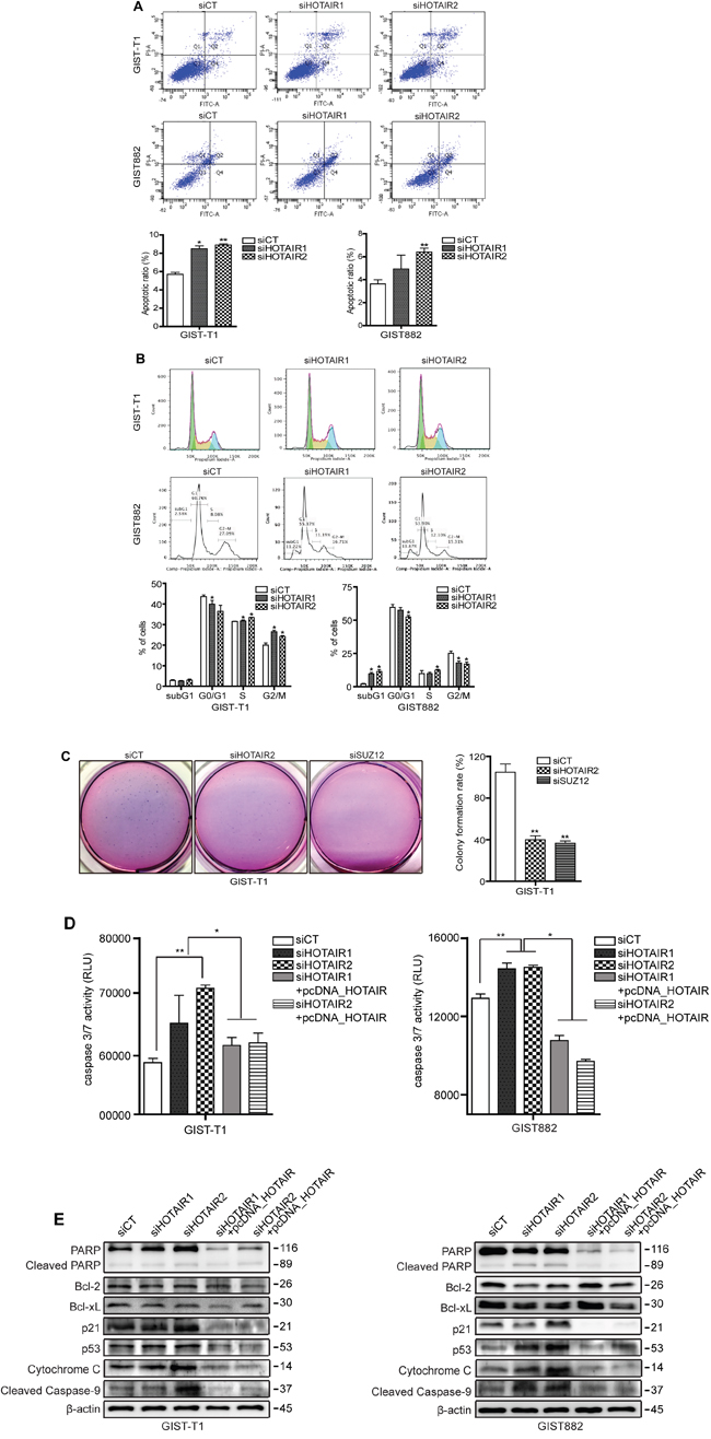 Figure 5: siHOTAIRs induce apoptosis and cell cycle arrest. GIST-T1 and GIST882 cells were transfected with siCT or siHOTAIRs. Apoptosis and cell cycle analysis were performed using PI/Annexin-V A. and PI B. staining. The bar represents ratio of apoptotic phase (A) and percentage of cells (B). siHOTAIR1 and siHOTAIR2 were compared to scrambled control (siCT). C. Soft agar colony formation was performed after treatment with siHOTAIRs or siSUZ12. The bar represents the rate of colony formation. siHOTAIR2 and siSUZ12 were compared to scrambled control (siCT). D. A caspase -3 and -7 assay was measured via ELISA after treatment with siCT, siHOAIRs or pcDNA-HOTAIR. siHOTAIR1 and siRHOTAIR2 were compared to scrambled controls (siCT). siHOTAIR1+pcDNA-HOTAIR and siHOTAIR2+pcDNA-HOTAIR were compared to siHOTAIR1 and siRHOTAIR2, respectively. E. Apoptotic and cell cycle markers were detected in transfected GIST cells via Western blot. Data shown are representative of three independent experiments (*P ≤ 0.05; **P ≤ 0.005).