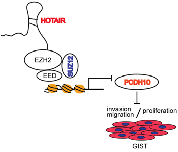Although a larger number of GIST samples will be required to further validate our findings, the present data suggest that the methylation of PCHD10 by HOTAIR may yield new insights in the pathogenesis and malignant potentials of GISTs, offering more aggressive surveillance and treatment.