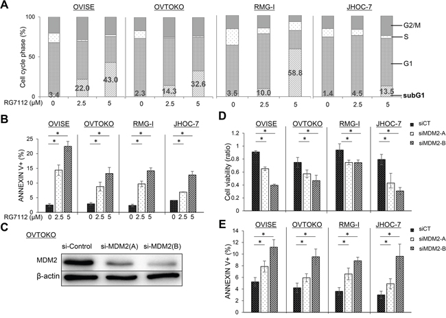 Figure 3: Induction of apoptosis after RG7112 treatment and MDM2 knockdown in clear cell carcinomas with wild type TP53. A. Cell cycle distribution after RG7112 treatment, as assessed by fluorescence-activated cell sorting. B. Apoptosis after RG7112 treatment, as evaluated by annexin V staining. C. siRNA knockdown of MDM2 in OVTOKO cells using MDM2-A and MDM2-B, as confirmed by western blotting. D. Cell viability after MDM2 knockdown was assessed by MTT assay. E. Apoptosis after MDM2 knockdown was assessed by annexin V assay. All experiments were repeated three times.