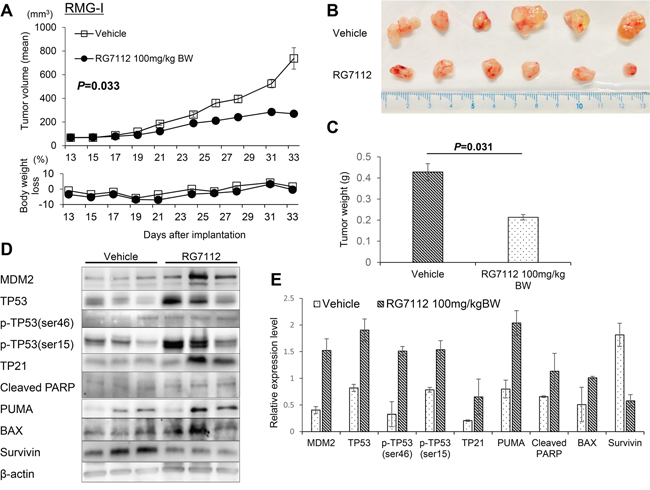 Figure 4: In vivo evaluation of RG7112 efficacy using xenografted RMG-I cells. A-C. Tumor size and body weight in xenograft mouse models orally treated with RG7112 were measured after the start of RG7112 treatment 13 days post implantation (A). Tumors were collected from mice sacrificed after 21 days of RG7112 treatment (B). Tumor weights were compared by t-test between control and RG7112-treated animals (C). D. TP53 phosphorylation and expression of TP53 target proteins were compared between tumors from control and RG7112-treated animals (n = 3 per group). E. Expression of each protein relative to beta-actin was quantified in Image J. All experiments were repeated thrice.
