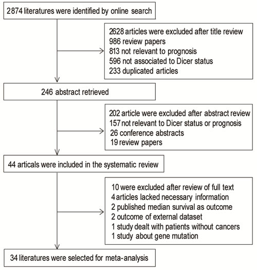 In the primary search of the online database, we got 2,874 publications in total, 2,628 of which were excluded after screening the titles. Abstracts of the remaining 246 publications were reviewed and 202 of them were excluded. The remaining 44 publications (Apir 15, 2016), which were completely case-control studies, were screening out as eligible for systematic review. Among the 44 literatures, there were 6 articles studying on breast cancer [11, 14-17], 5 literature about colorectal cancer [10, 12, 18-20], 7 researches on other digestive cancer [21-27], 4 studies on ovarian cancer [9, 13, 28, 29] and 2 on other gynecology cancer [30, 31]. ENT tumors were analyzed in 5 publications [32-36], while hematological cancer such as AML or CLL were describe in 7 articles [37-43], together with 3 papers dealing with prognosis of lung cancer [44-46], 2 studies about neuroblastoma [47, 48],1 research on soft tissue sarcoma [49], 1 study on melanoma cell invasion [50] and 1 study on bladder carcinoma [51]. We reviewed all of the 44 publications in detail, and finally excluded 10 articles from meta-analysis as follows: 4 articles lacked necessary information [23, 25, 32, 50], 2 outcome of external dataset, 1 study only reporting outcome of patients without cancers, 1 study about gene mutation and 2 study reporting the outcome of patients in median survival [17, 18, 20, 41, 42], as shown in Figure 1. Three investigators reviewed all of the 44 candidate articles independently and got an agreement on the exclusion. Among all kinds of these tumors, twenty-four (24/34, 70.59%) articles showed a positive relationship between low Dicer level and poor prognosis results, meanwhile, ten (10/34, 29.41%) studies revealed a negative outcome. Global quality assessment score of the articles included in meta-analysis ranged from 50% to 93.75%, with a median of 76.12%. Detail features of these studies were shown in S1_Table 1 in supplementary file.