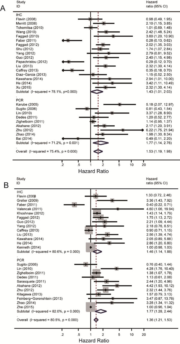 Meta-analysis of the 26 literatures was performed and subgroups were divided by different laboratory methods as IHC (1,403/1,369) and PCR (588/616) method. The overall heterogeneity in this analysis was high (I2 = 75.4%, P = 0.000) while the heterogeneity in IHC and PCR subgroups were also quite obvious (I2 = 78.1%, P = 0.000; I2 = 71.2%, P = 0.001). Low Dicer expression was associated with poor OS in the overall analysis with HR = 1.53, 95% CI: 1.19-1.98 and Z = 3.29, P = 0.001. In the subgroup analysis according to different laboratory methods, subgroup using IHC method (HR = 1.43, 95% CI: 1.01-2.43) and PCR method (HR = 1.77, 95% CI: 1.14-2.76) both showed a positive result that low Dicer expression level reveled poor OS. Significance tests for IHC subgroup and RT-PCR subgroup were Z = 2.03, P = 0.042; Z = 2.55, P = 0.011, respectively.